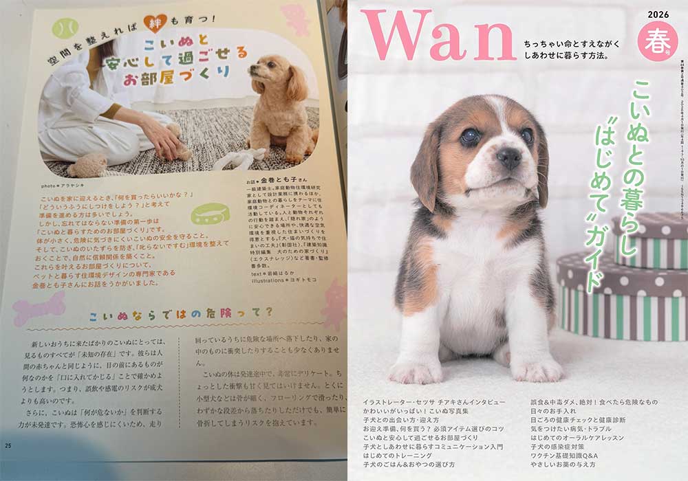 緑書房さん発行の犬の雑誌「Wan 」2026年 1月号に続き、4月号<春号>「こいぬとの暮らし”はじめて”ガイド」にて、「こいぬと安心して過ごせるお部屋づくり」の監修協力いたしました。